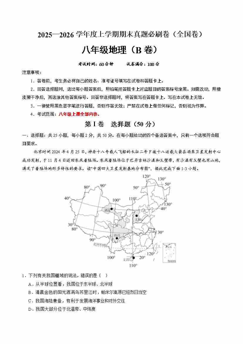 首页 > 全部 > 期末试卷 > 全国卷B(八年级地理·期末真题·必刷卷)-【期末真题·必刷卷】(解析版)