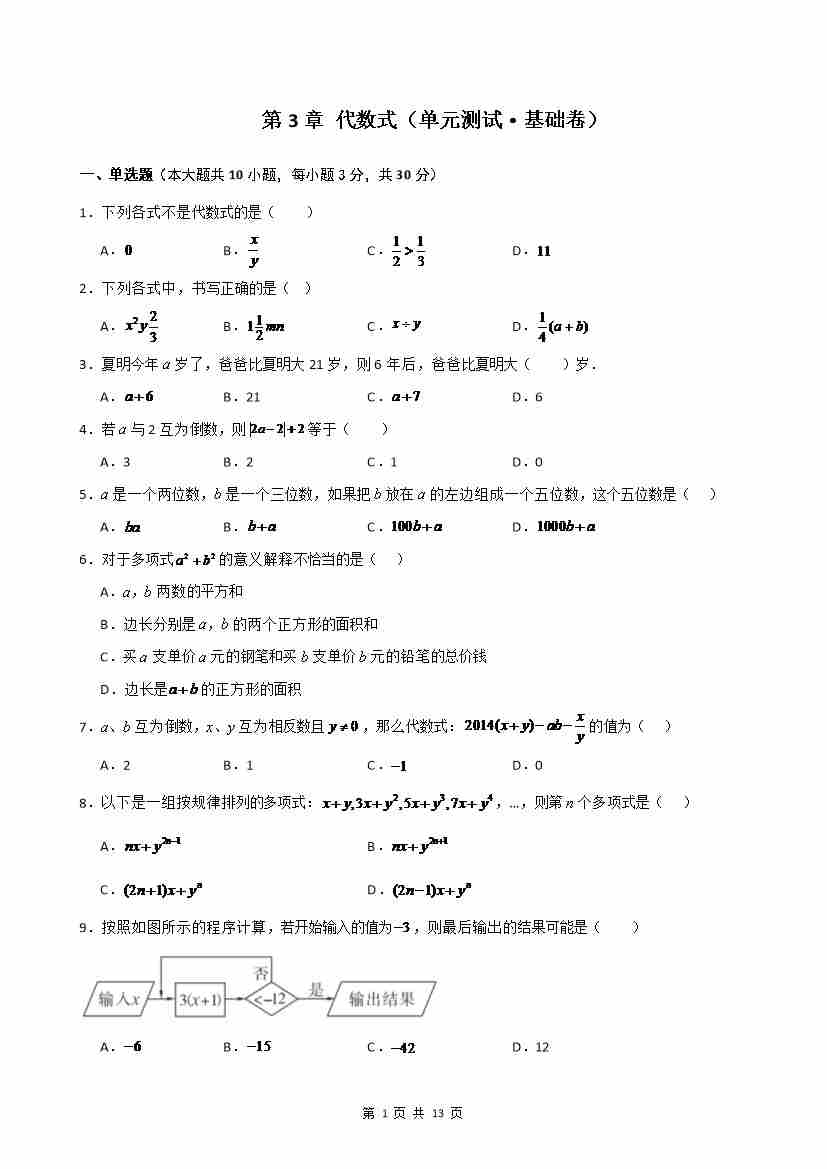首页 > 全部 > 单元培优卷 > 第3章 代数式(单元测试·基础卷)-2024-2025学年七年级数学上册基础知识专项突破讲与练(人教版)