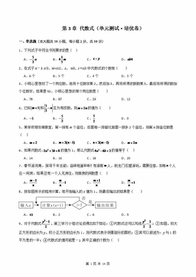 第3章 代数式(单元测试·培优卷)-2024-2025学年七年级数学上册基础知识专项突破讲与练(人教版)