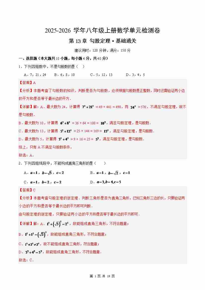 第13章 勾股定理(单元测试·基础卷)(解析版)