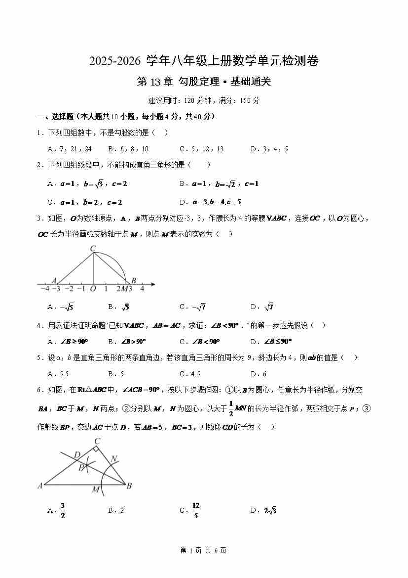首页 > 全部 > 单元AB卷 > 第13章 勾股定理(单元测试·基础卷)(考试版A4)