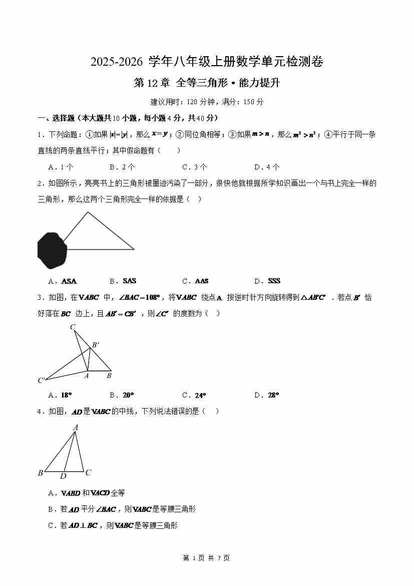 第12章 全等三角形(单元测试·提升卷)(考试版A4)
