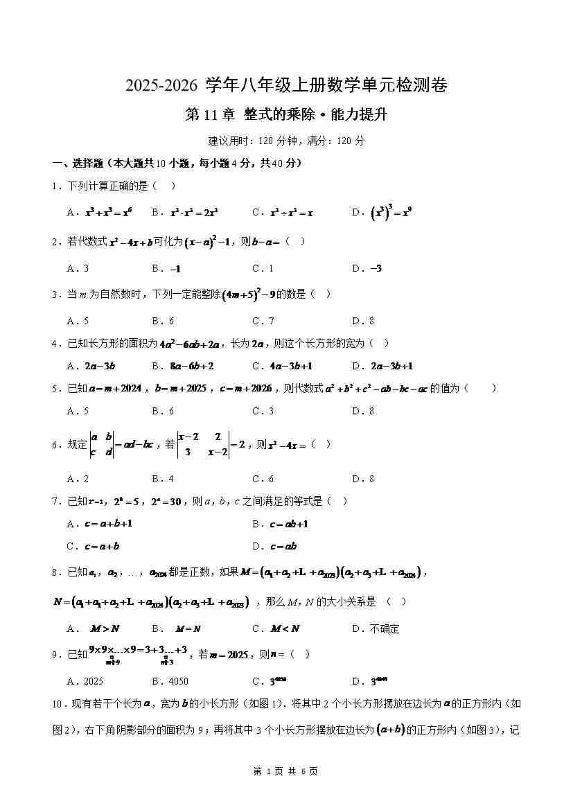 首页 > 全部 > 单元AB卷 > 第11章 整式的乘除(单元测试·提升卷)(考试版A4)