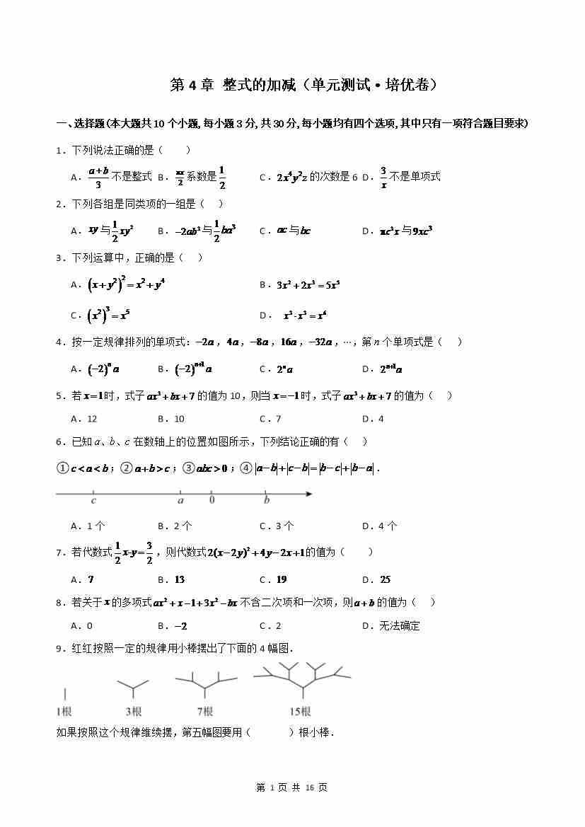 首页 > 全部 > 单元培优卷 > 第4章 整式的加减(单元测试·培优卷)-2024-2025学年七年级数学上册基础知识专项突破讲与练(人教版)