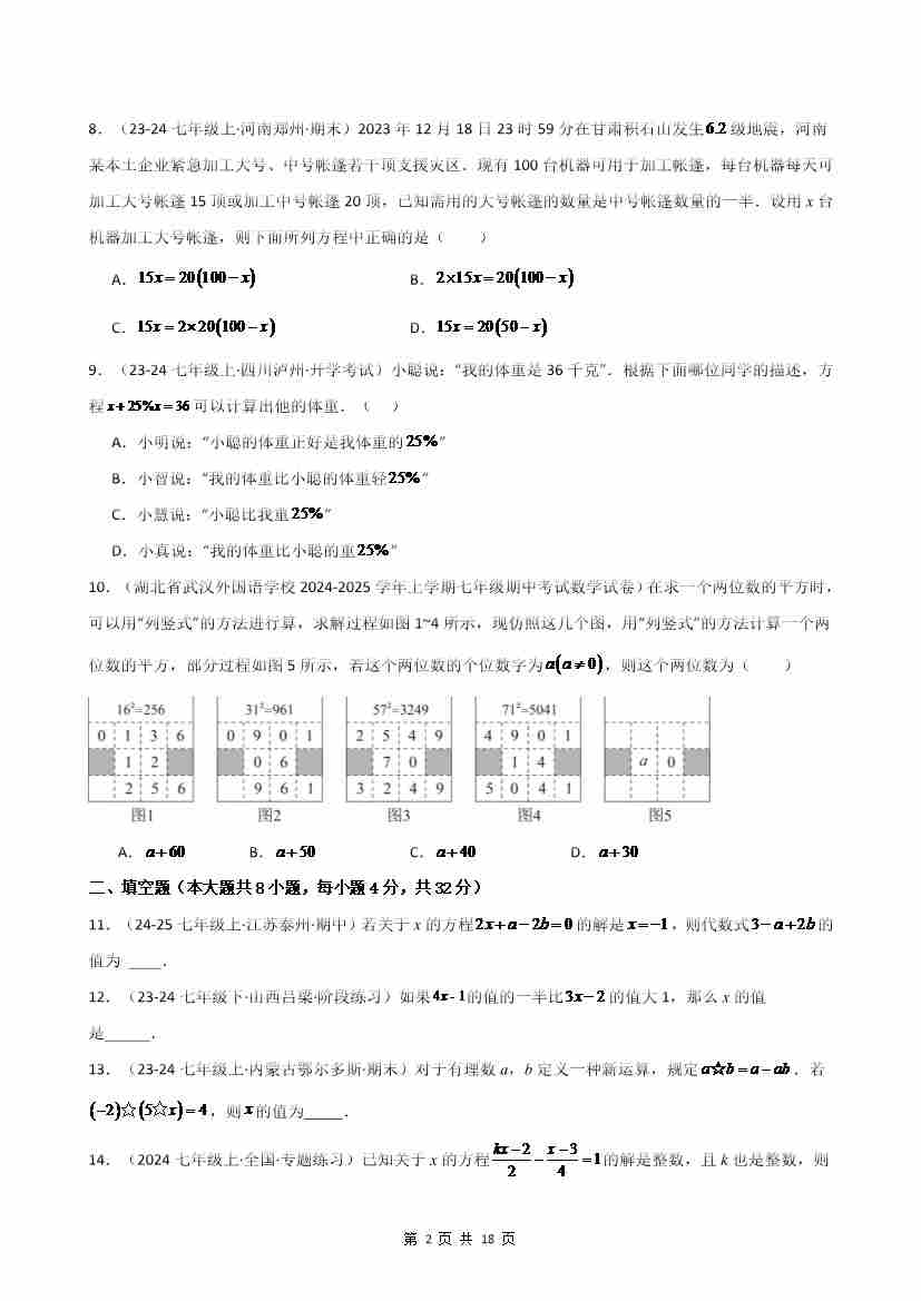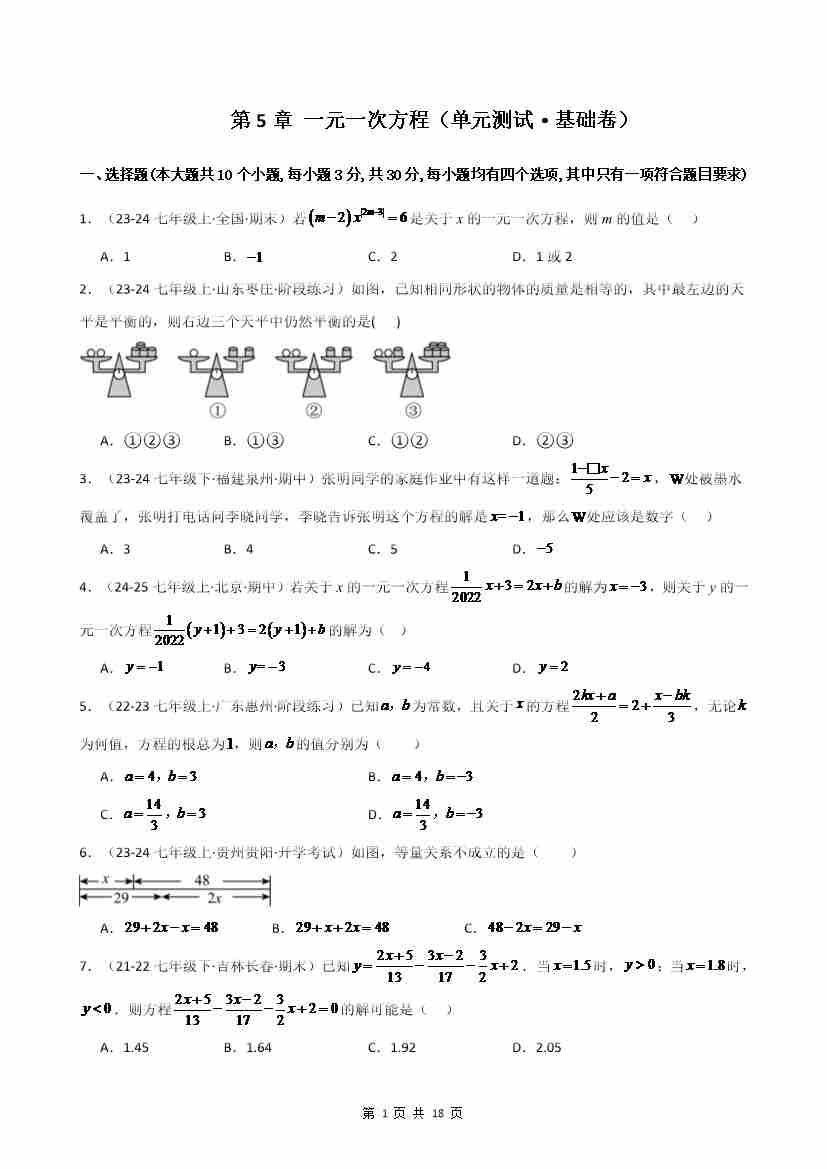 首页 > 全部 > 单元培优卷 > 第5章 一元一次方程(单元测试·基础卷)-2024-2025学年七年级数学上册基础知识专项突破讲与练(人教版)