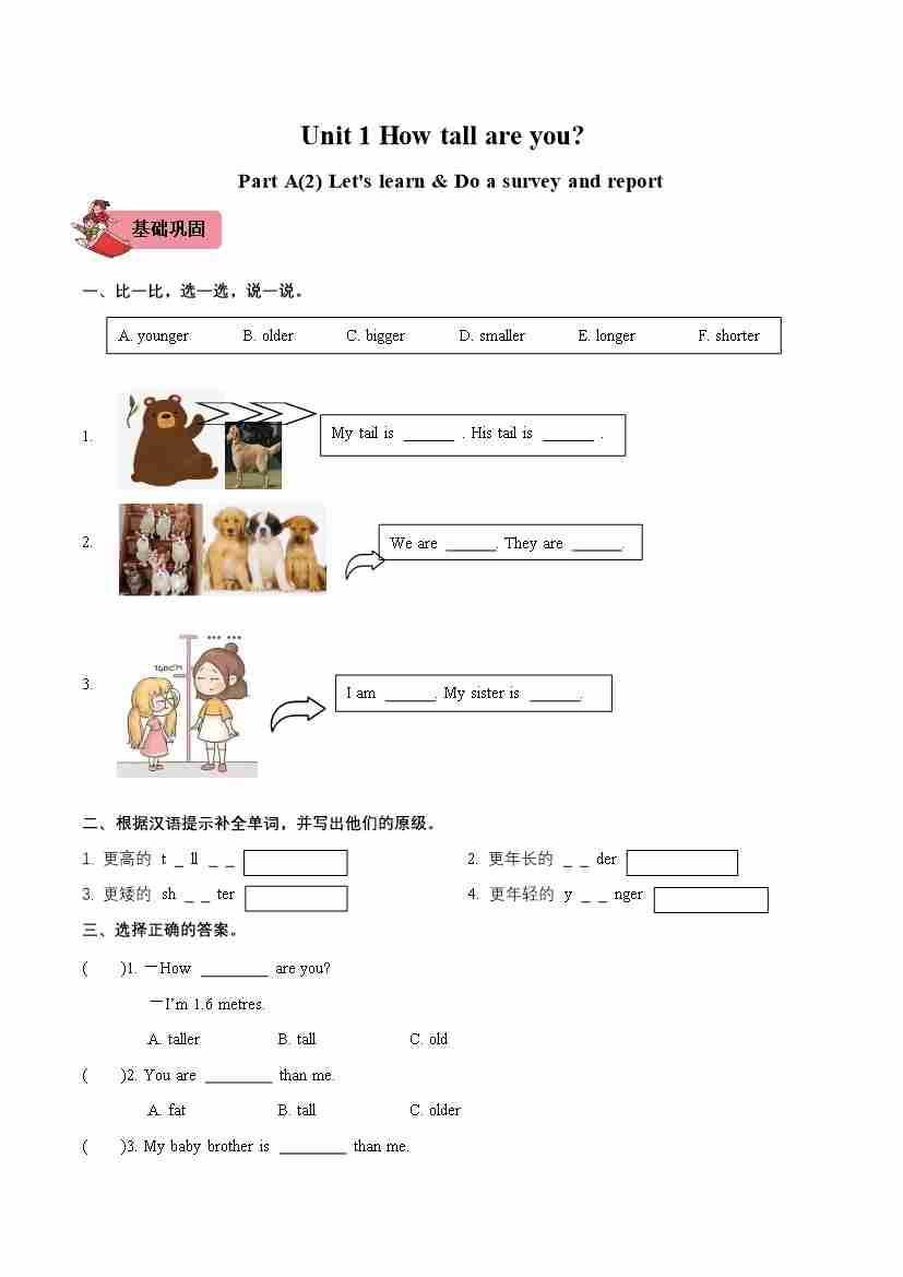 首页 > 全部 > 一课一练 > Unit1 How tall are you PartA Let's learn& Do a survey and report(第2课时)-六年级英语下册(人教PEP版)