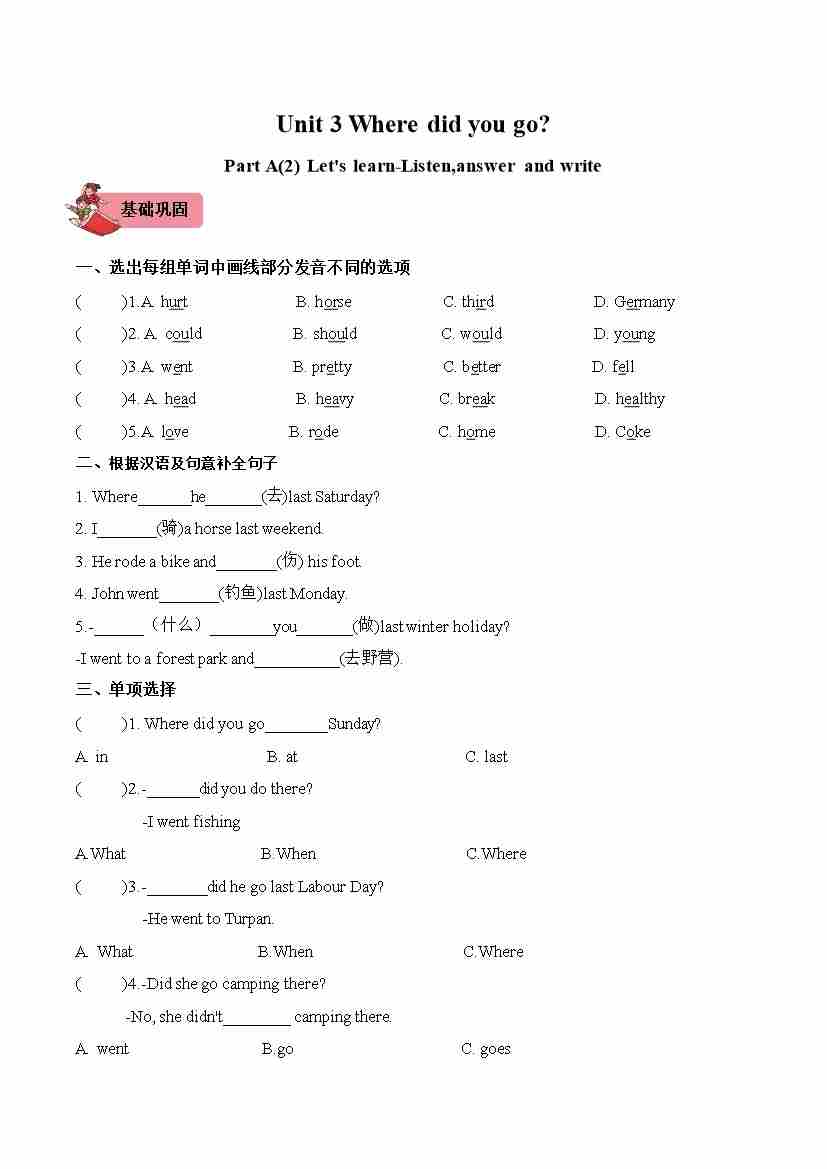Unit3 Where did you go PartA Let's learn-Listen,answer and write(第2课时)同步分层作业-六年级英语下册(人教PEP版)