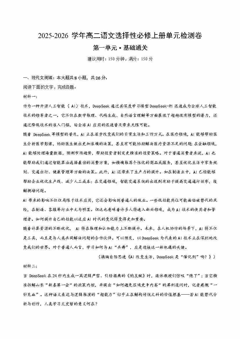 首页 > 全部 > 单元测试 > 高二选必上语文第一单元测试·基础卷(考试版A4)