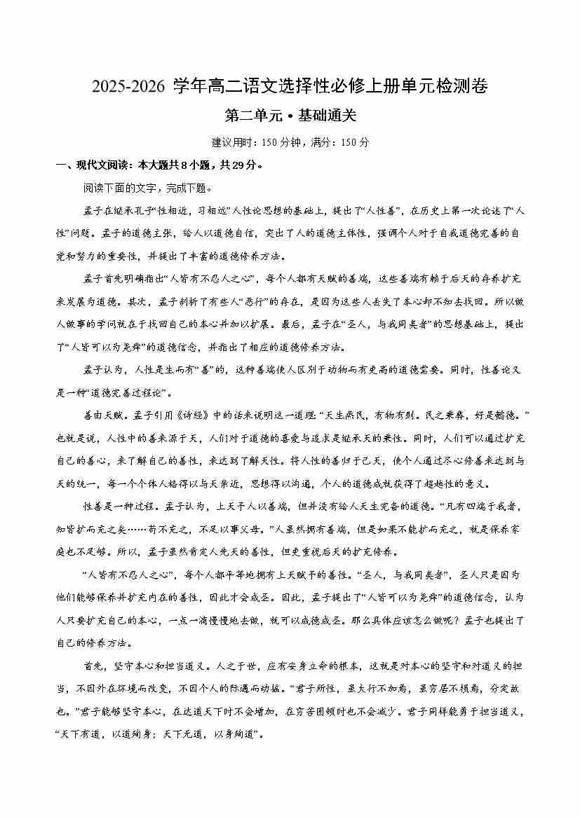 首页 > 全部 > 单元测试 > 高二选必上语文第二单元测试·基础卷(考试版A4)