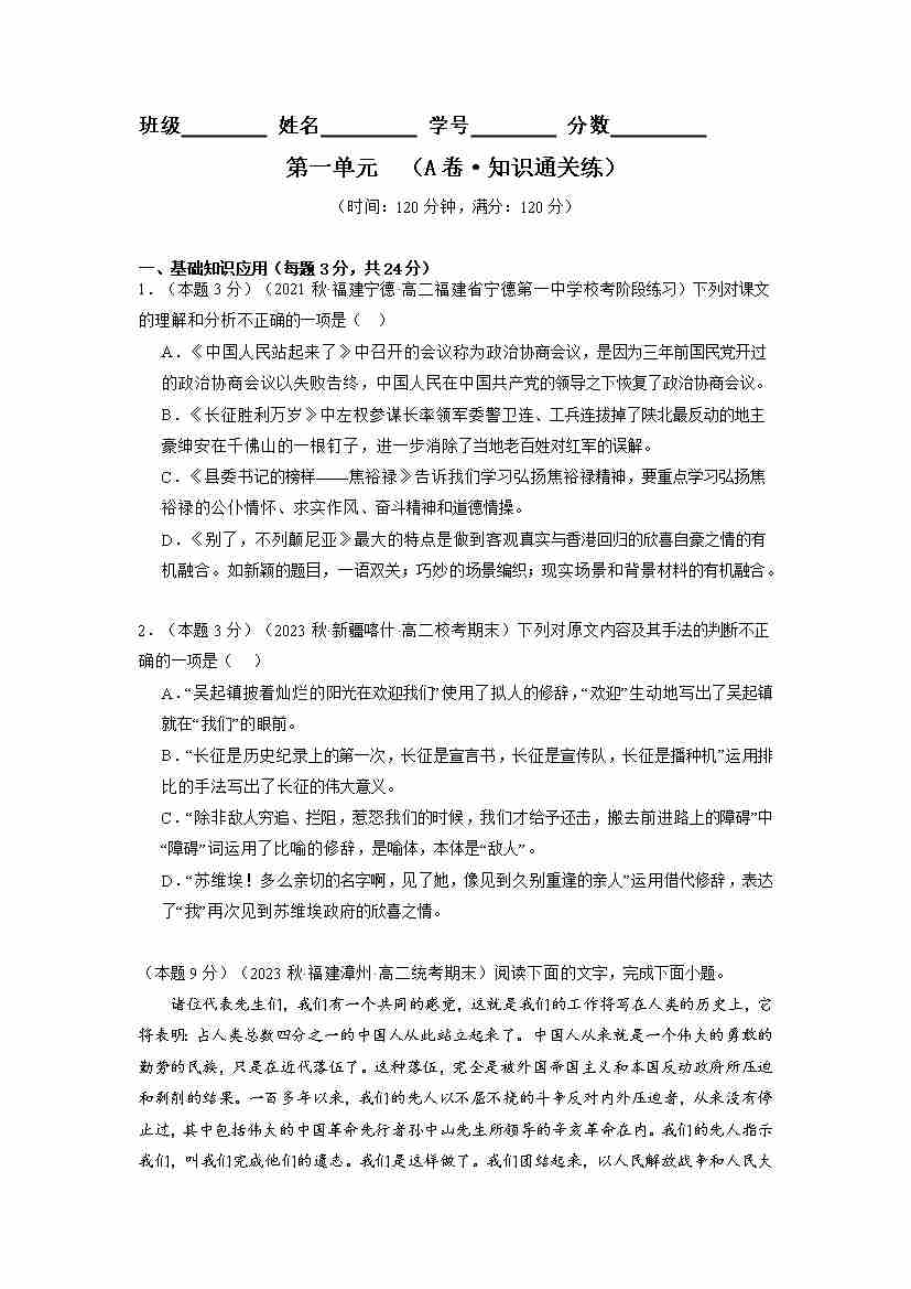 首页 > 全部 > 单元AB卷 > 第一单元(单元检测)(A卷•知识通关练)(学生版)