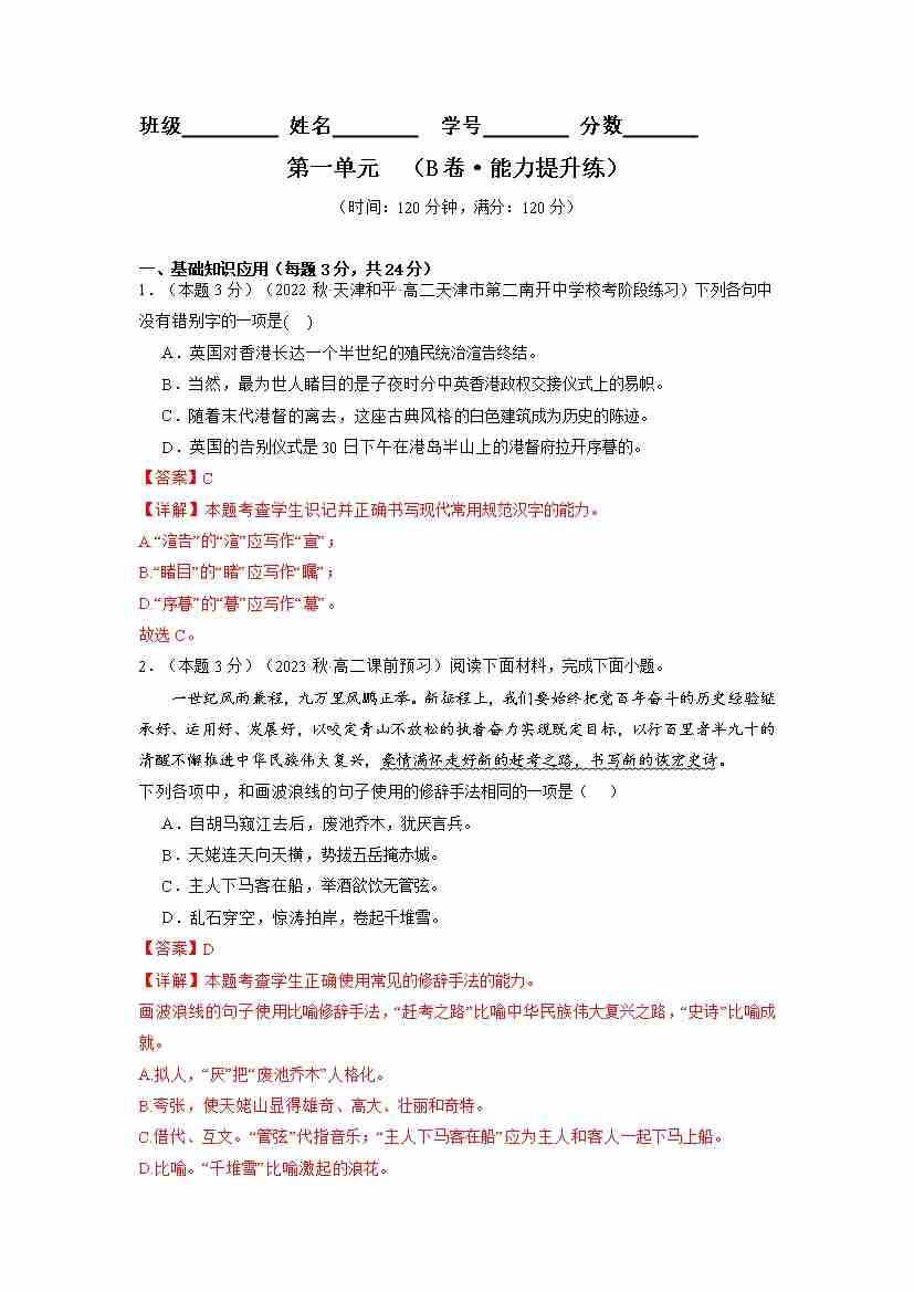第一单元(单元检测)(B卷•能力提升练)(教师版)