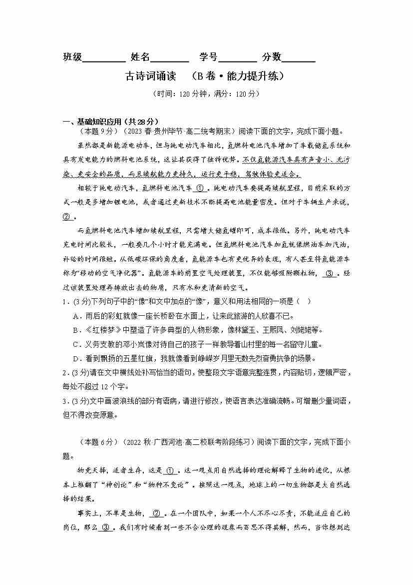古诗词诵读(单元检测)(B卷•能力提升练)(学生版)
