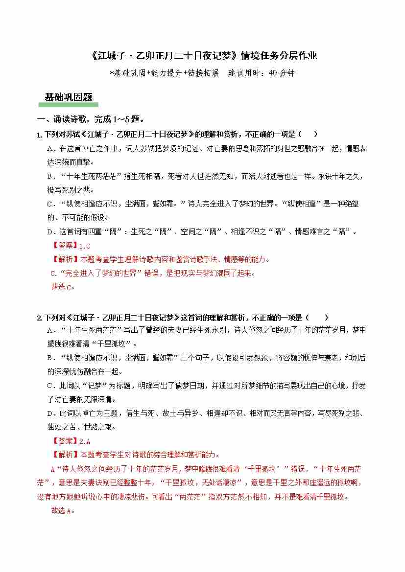 首页 > 全部 > 分层作业 > 《江城子·乙卯正月二十夜记梦》分层作业(解析版)