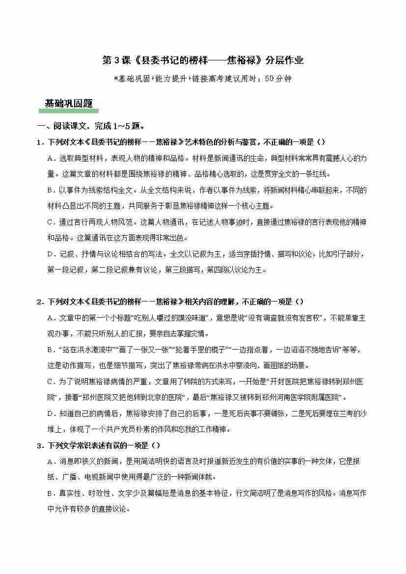 首页 > 全部 > 分层作业 > 《县委书记的榜样——焦裕禄》分层作业(原卷版)