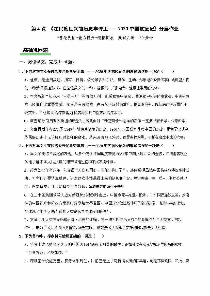 《在民族复兴的历史丰碑上——2020中国抗疫记》分层作业(原卷版)