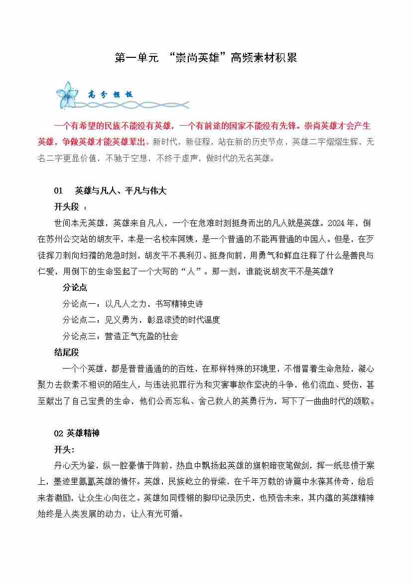 首页 > 全部 > 单元作文 > 专题03:“英雄主题 ”高频素材积累-(统编版选必上册)