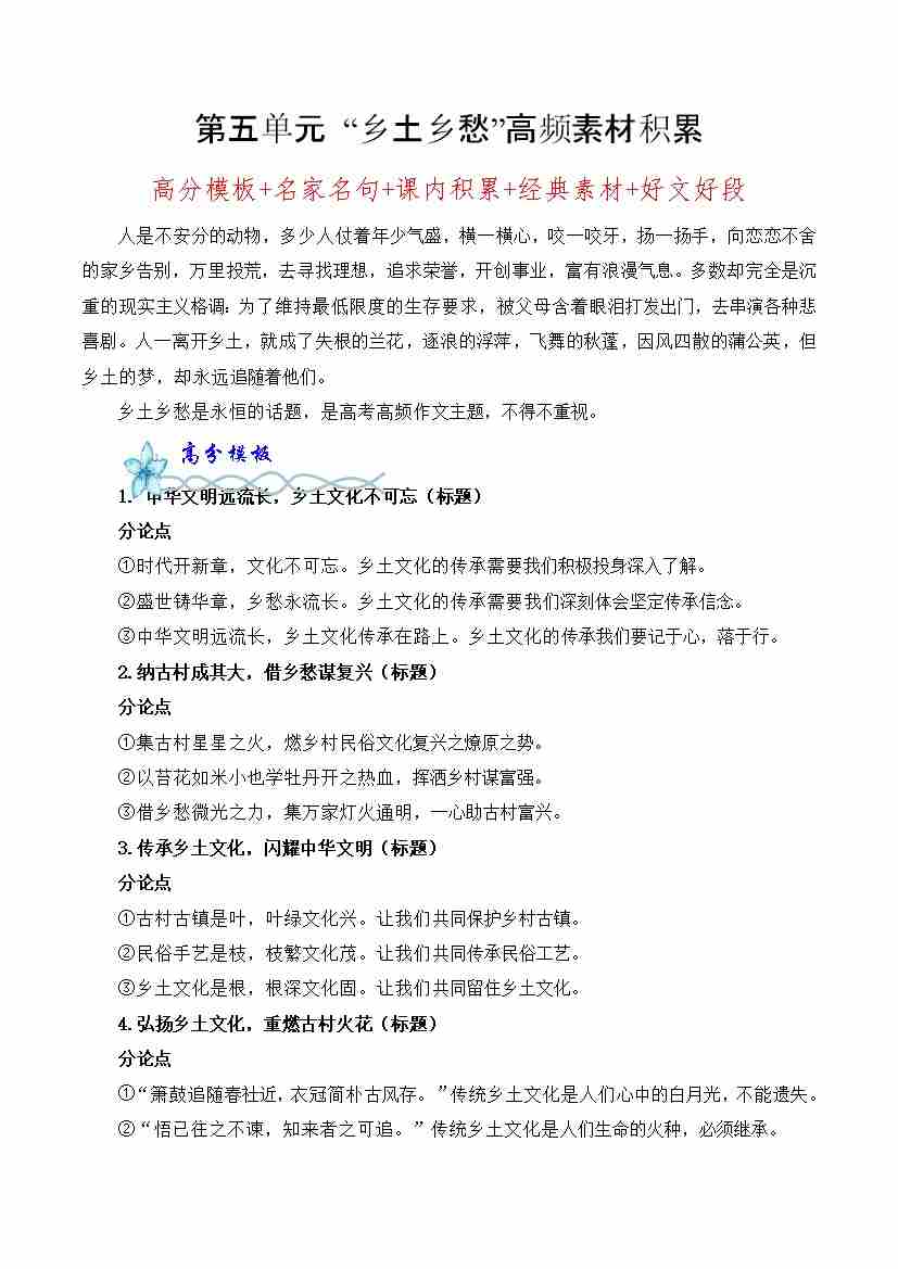 首页 > 全部 > 单元作文 > 专题03:“乡土乡愁”高频素材积累-(统编版必修上册)