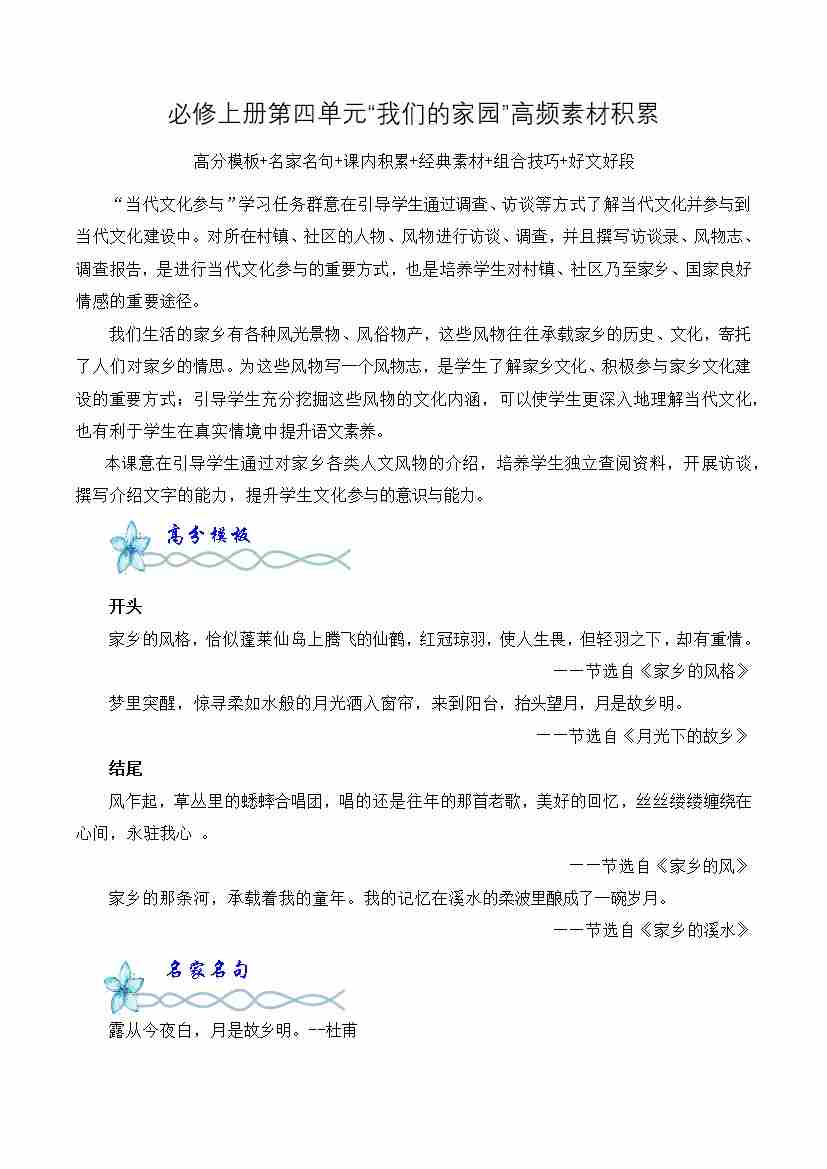 首页 > 全部 > 单元作文 > 专题03:“我们的家园”高频素材积累-(统编版必修上册)
