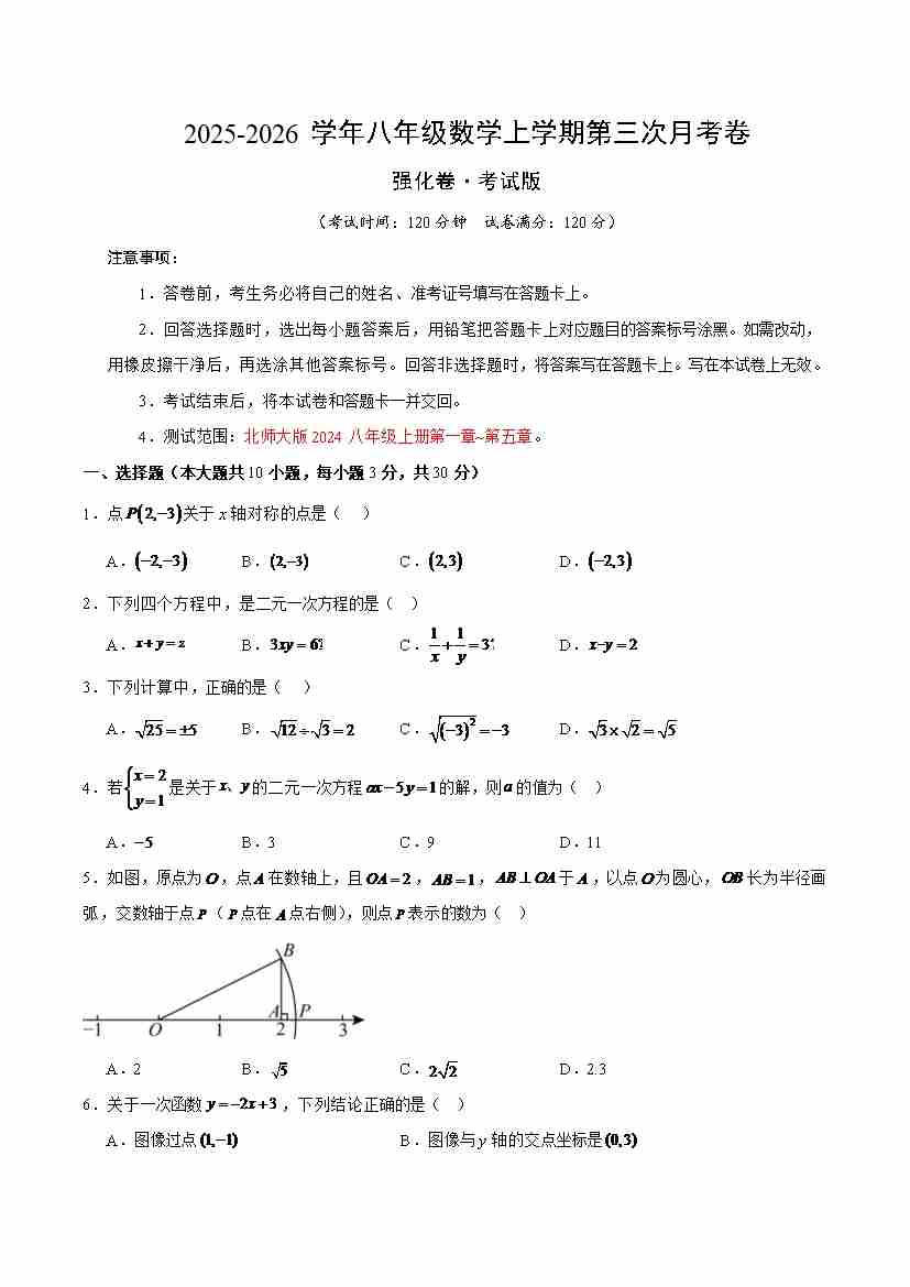 首页 > 全部 > 月考试卷 > 八年级数学上学期第三次月考(北师大版2024第一章~第五章,高效培优·强化卷)(考试版A4)