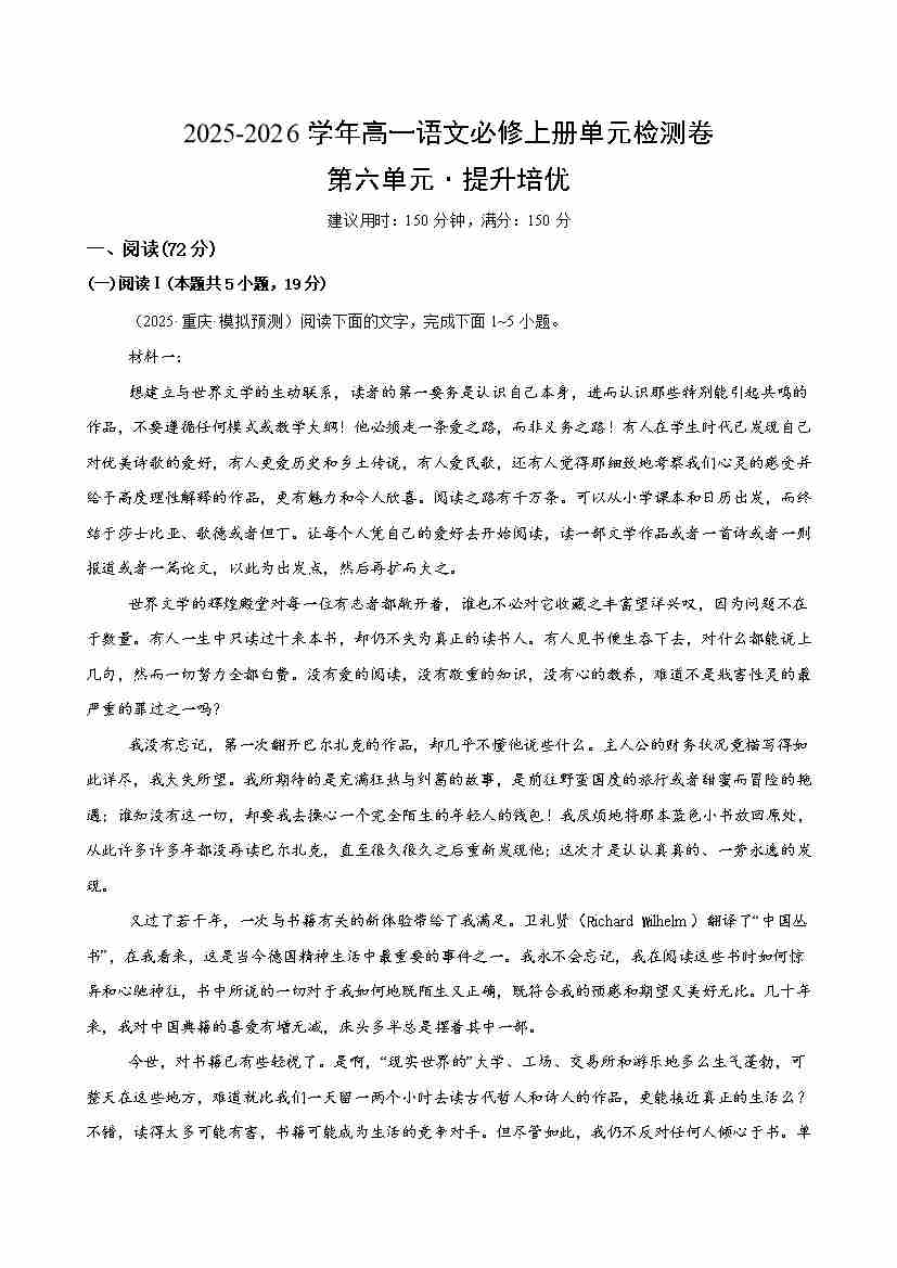 首页 > 全部 > 单元提升卷 > 高一语文第六单元测试·提升卷(考试版A4)1