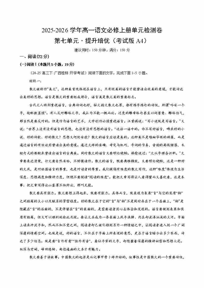 高一语文第七单元测试·提升卷(考试版A4)1