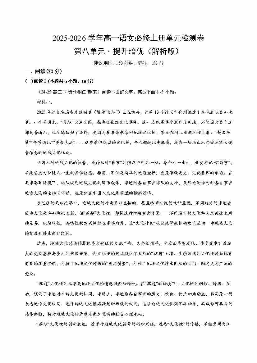 首页 > 全部 > 单元提升卷 > 高一语文第八单元测试·提升卷(解析版)