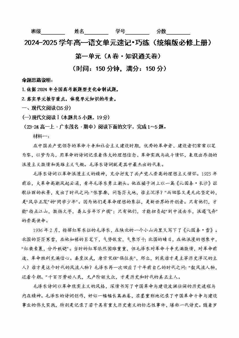 首页 > 全部 > 单元AB卷 > 第一单元(A卷·知识通关卷)(统编版必修上册)学生版