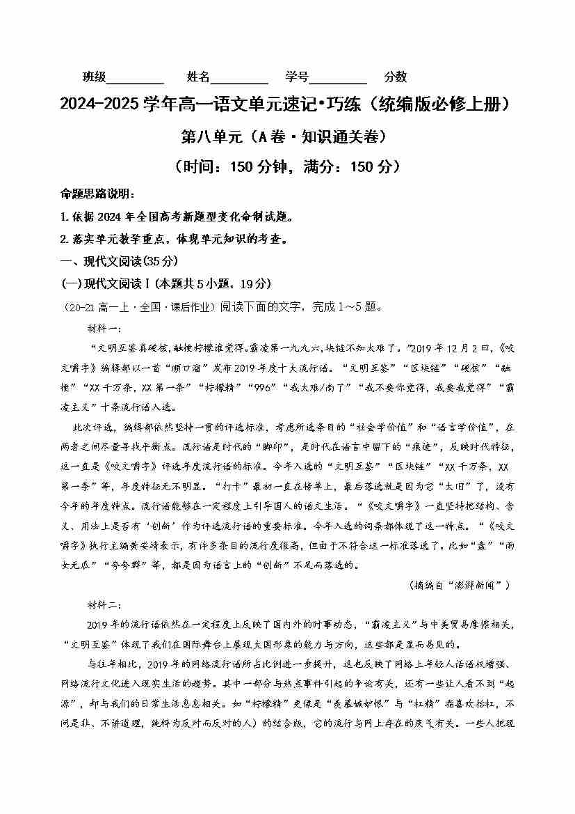 首页 > 全部 > 单元AB卷 > 第八单元(A卷·知识通关卷)学生版
