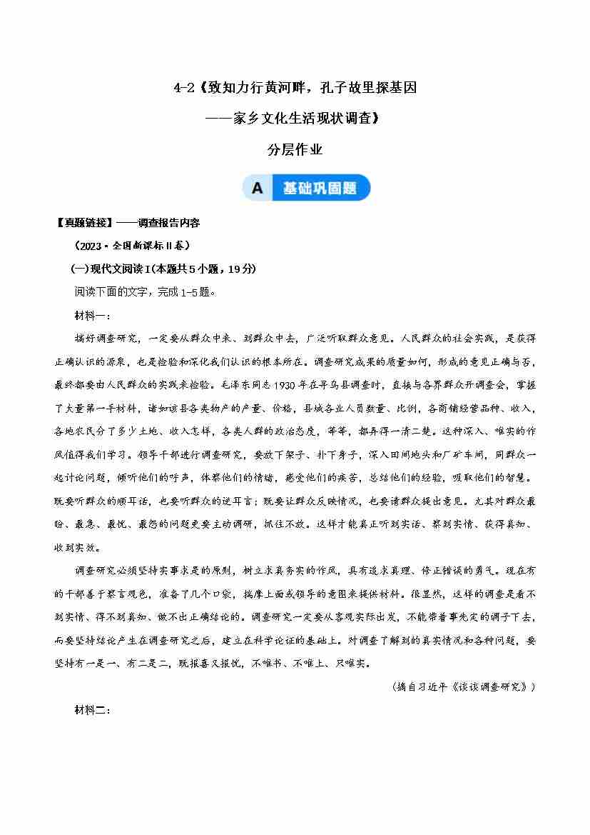 首页 > 全部 > 分层作业 > 4.2 致知力行黄河畔,孔子故里探基因——家乡文化生活现状调查(分层作业)(原卷版)