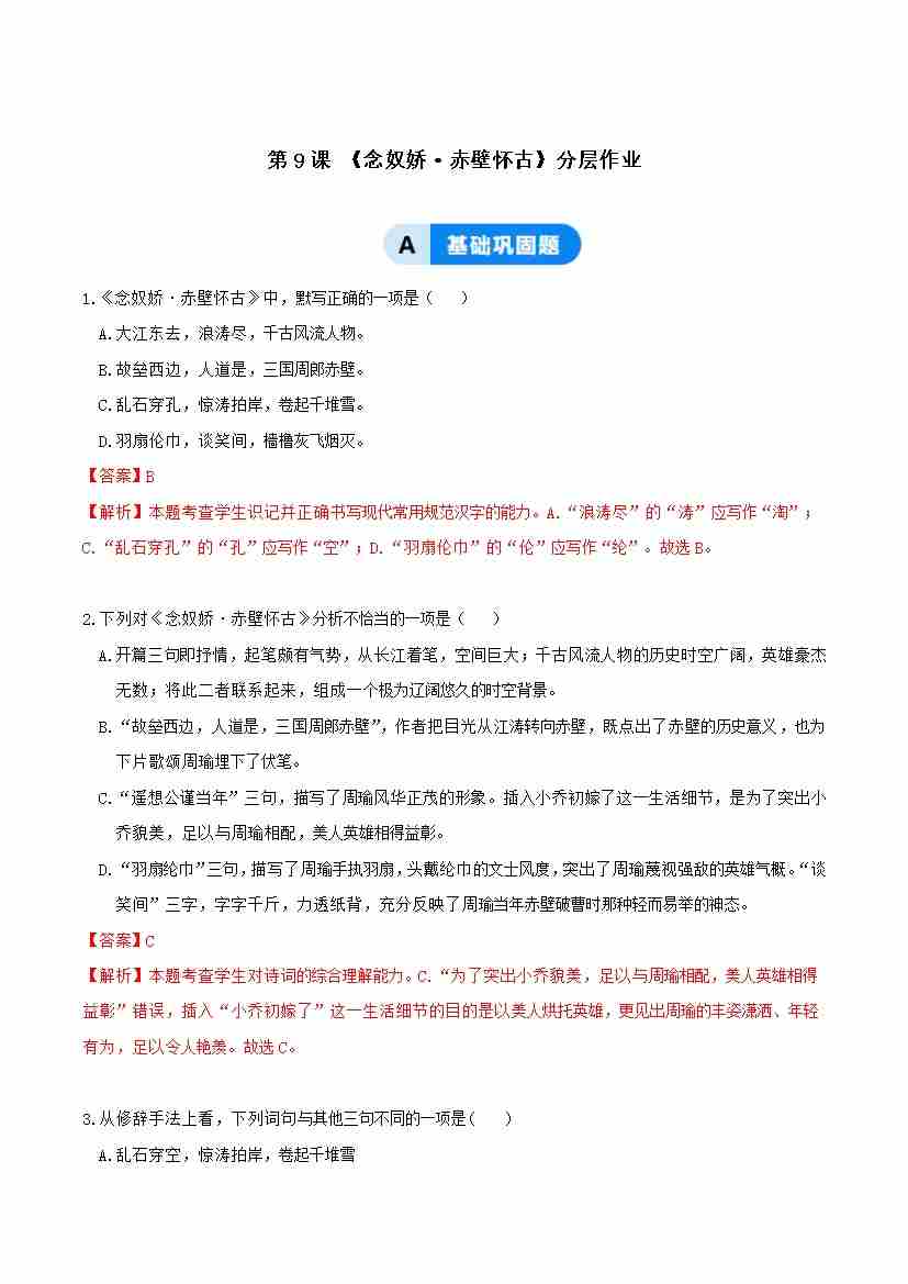 9-1 念奴娇·赤壁怀古:在历史与江月间的生命回响(主题任务式分层作业)(解析版)