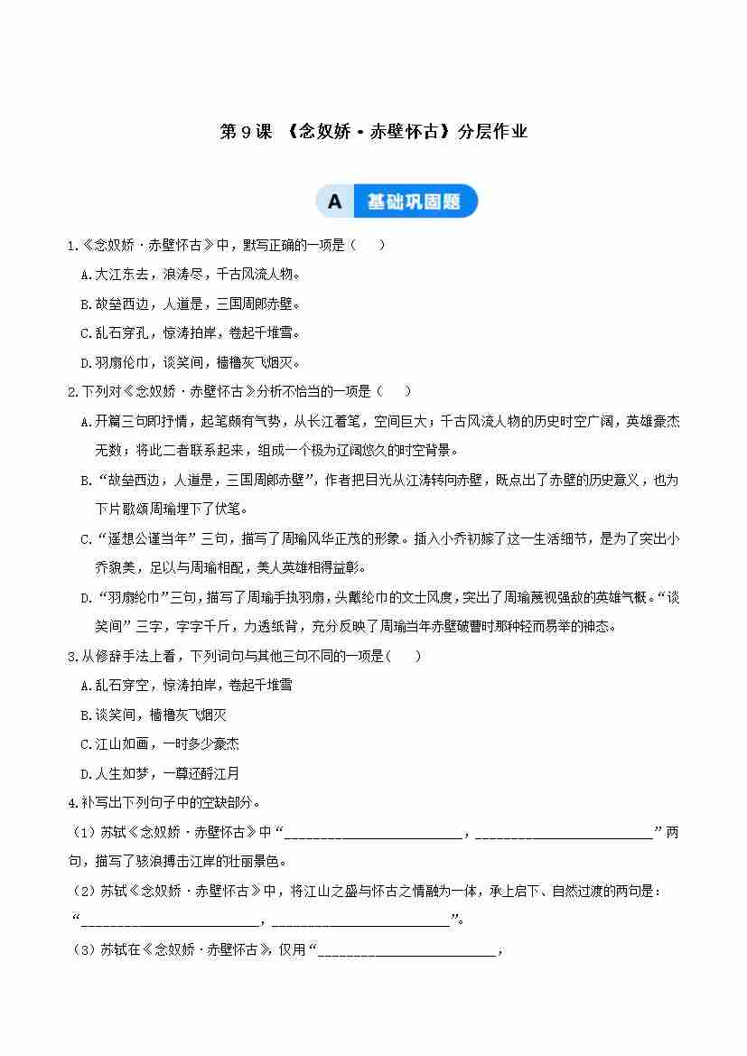 9-1 念奴娇·赤壁怀古:在历史与江月间的生命回响(主题任务式分层作业)(原卷版)