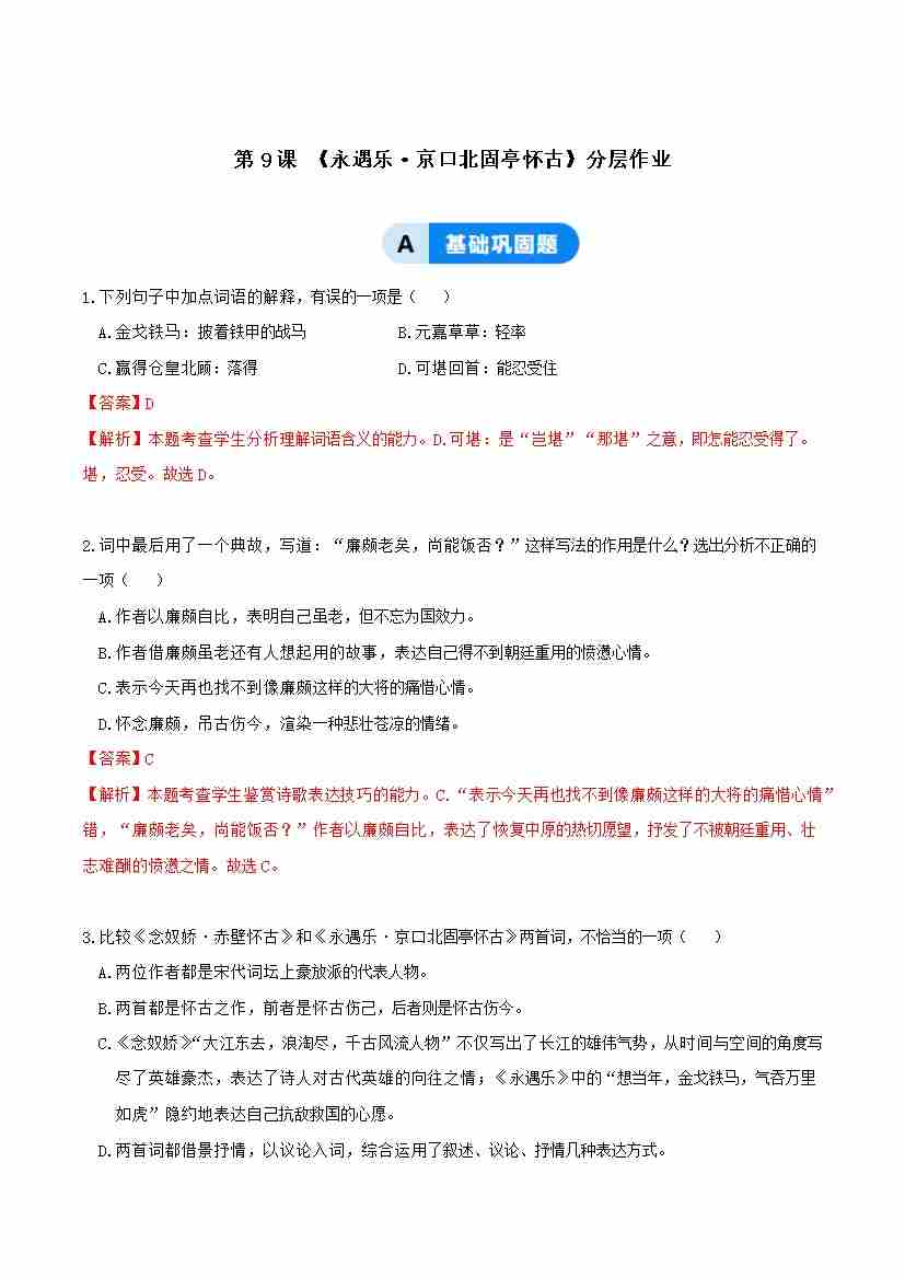首页 > 全部 > 分层作业 > 9-2 永遇乐·京口北固亭怀古:典故里的生命呐喊(主题任务式分层作业)(解析版)