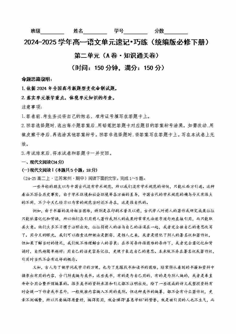 首页 > 全部 > 单元AB卷 > 第二单元(A卷·知识通关卷)学生版1