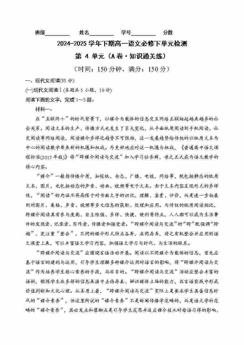 首页 > 全部 > 单元AB卷 > 第四单元(单元检测)(A卷·知识通关练)统编版必修下册)(学生版)