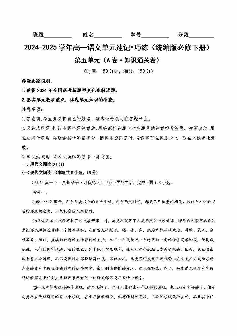 第五单元(A卷·知识通关卷)(统编版必修下册)教师版