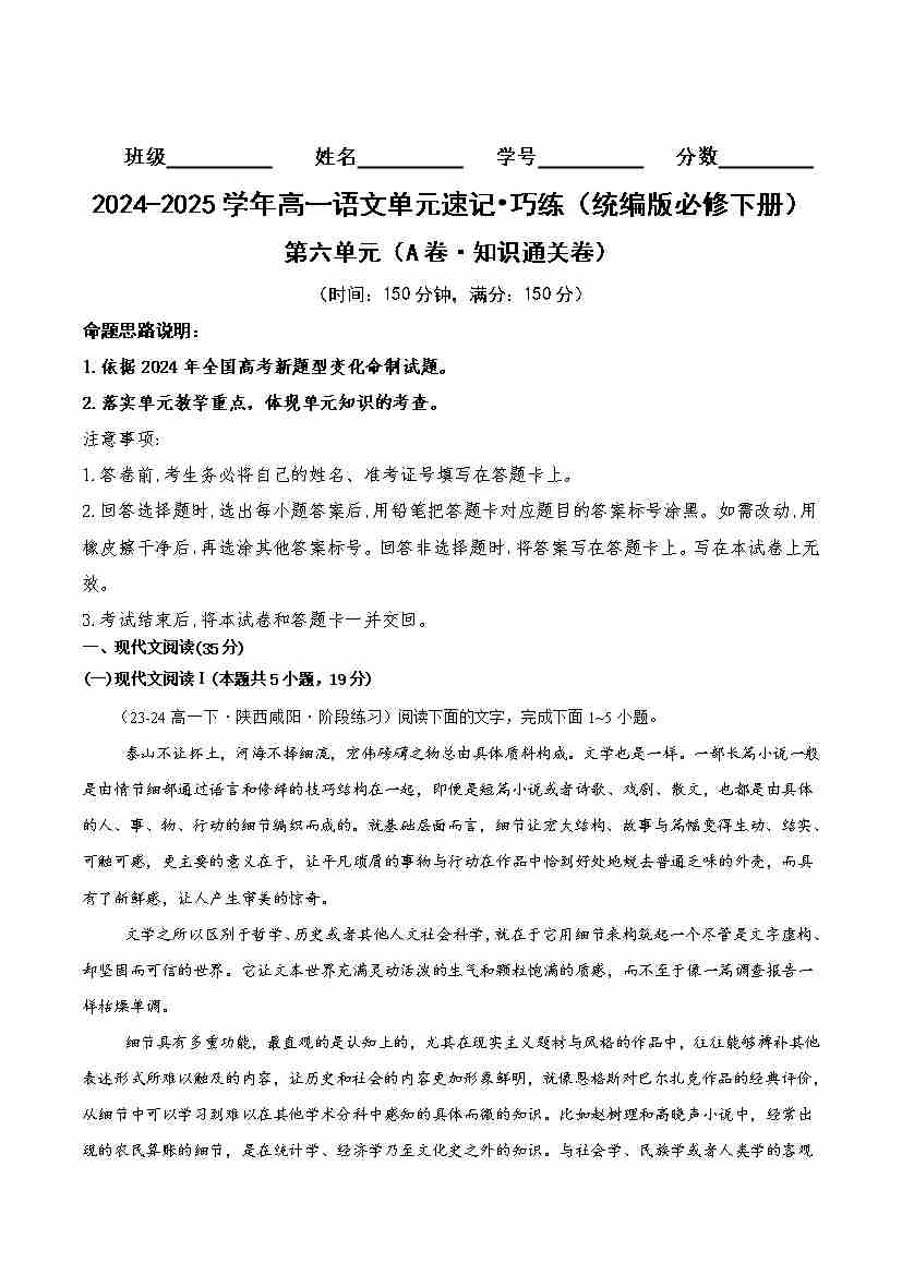首页 > 全部 > 单元AB卷 > 第六单元(A卷·知识通关卷)(统编版必修下册)教师版