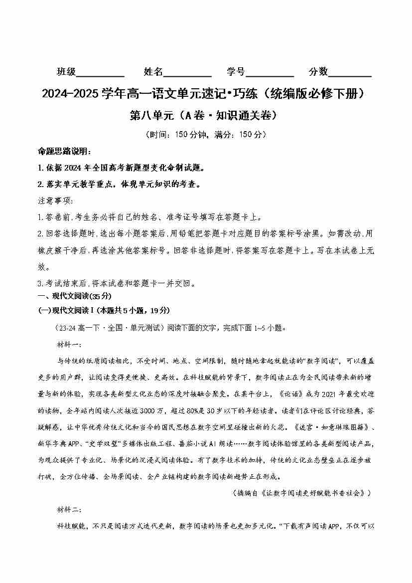 第八单元(A卷·知识通关卷)(统编版必修下册)教师版