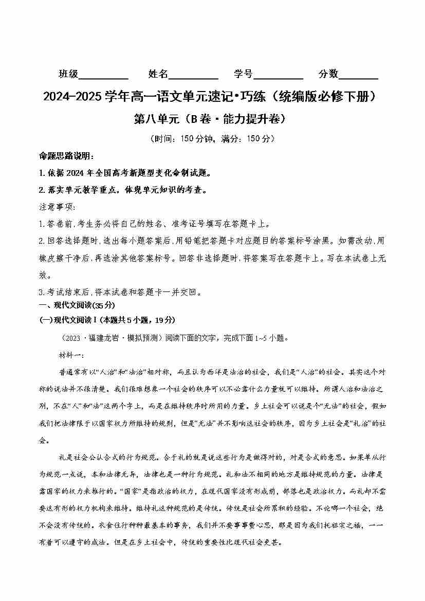 第八单元(B卷·能力提升卷)(统编版必修下册)学生版