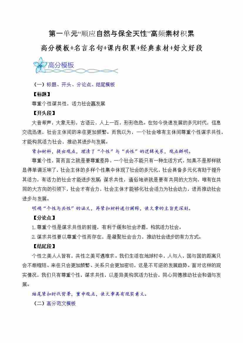 首页 > 全部 > 单元作文 > 专题03:“顺应自然与保全天性”高频素材积累-(统编版必修下册)