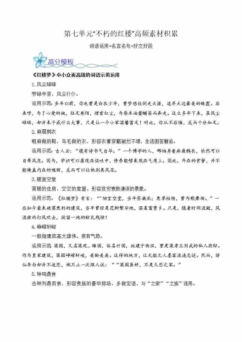 首页 > 全部 > 单元作文 > 专题03:“不朽的红楼”高频素材积累-(统编版必修下册)