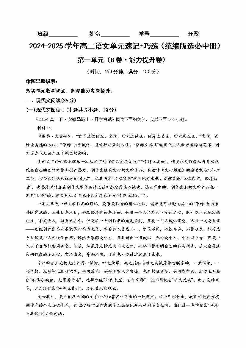首页 > 全部 > 单元AB卷 > 第一单元(B卷·能力提升卷)教师版