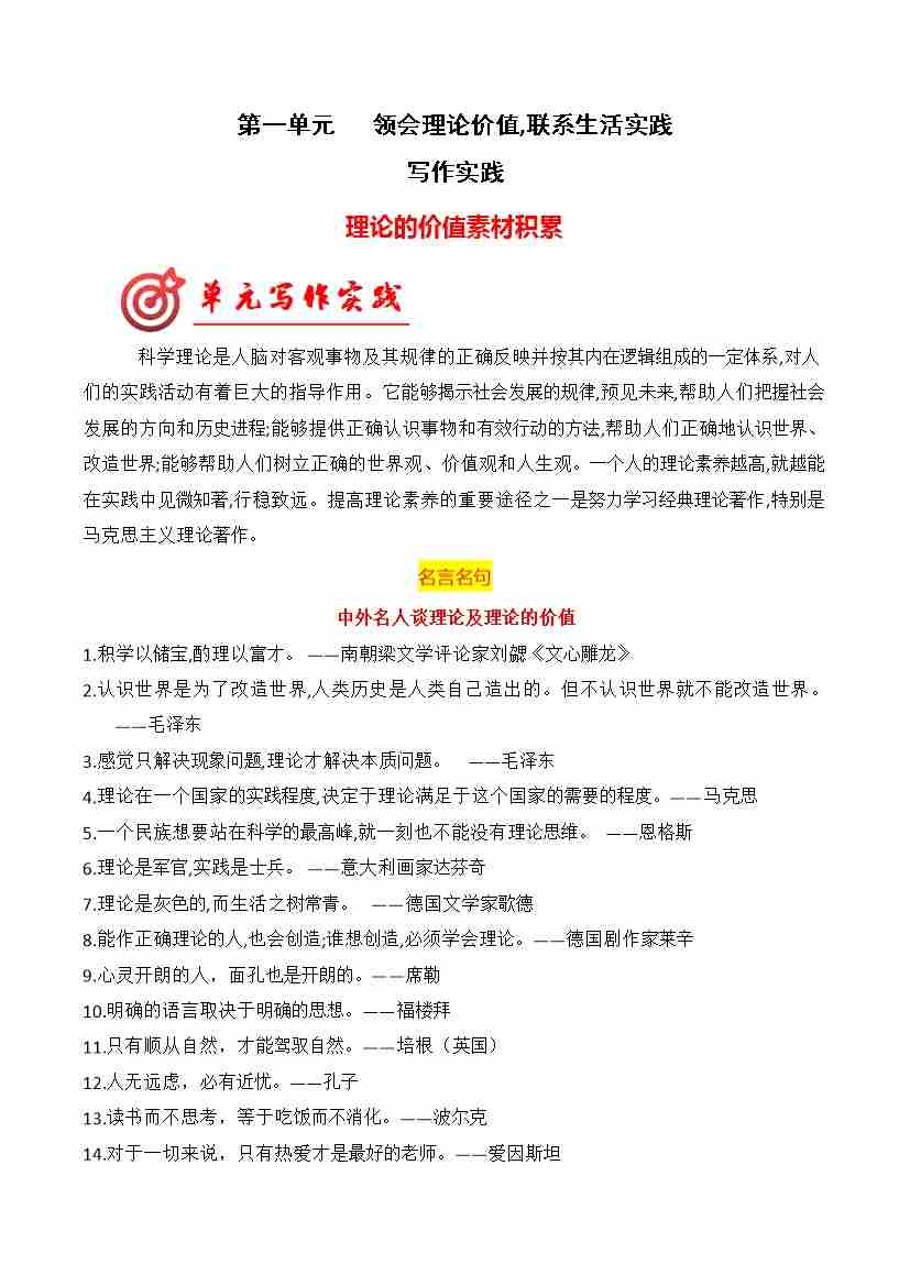 首页 > 全部 > 单元作文 > 专题01:“领会理论价值,联系生活实践”素材积累(统编版选必中册)