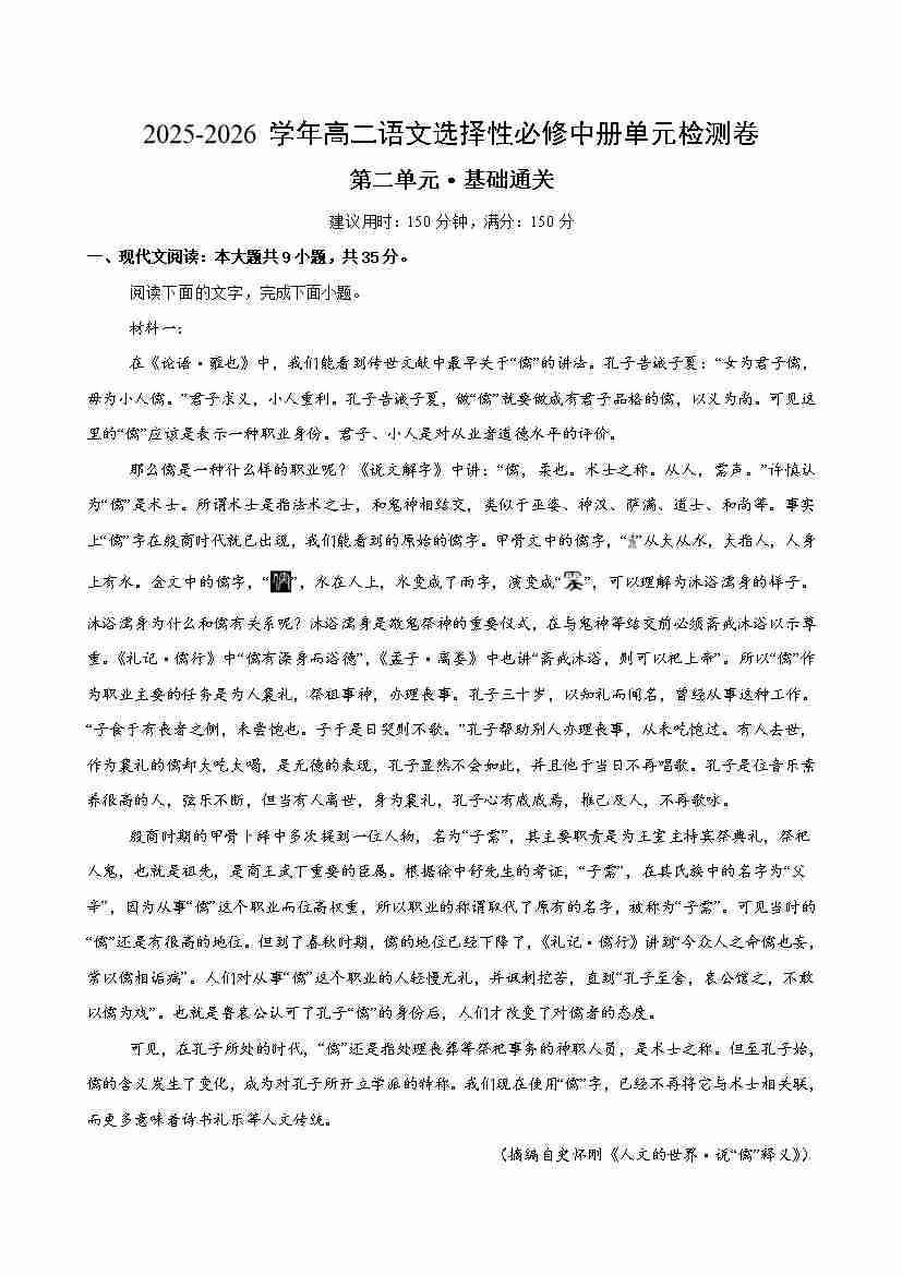首页 > 全部 > 单元基础卷 > 高二选必中语文第二单元·基础卷(考试版A4)