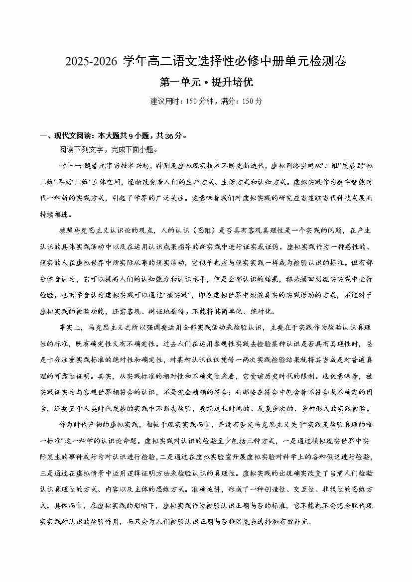首页 > 全部 > 单元提升卷 > 高二选必中语文第一单元·提升卷(考试版A4)