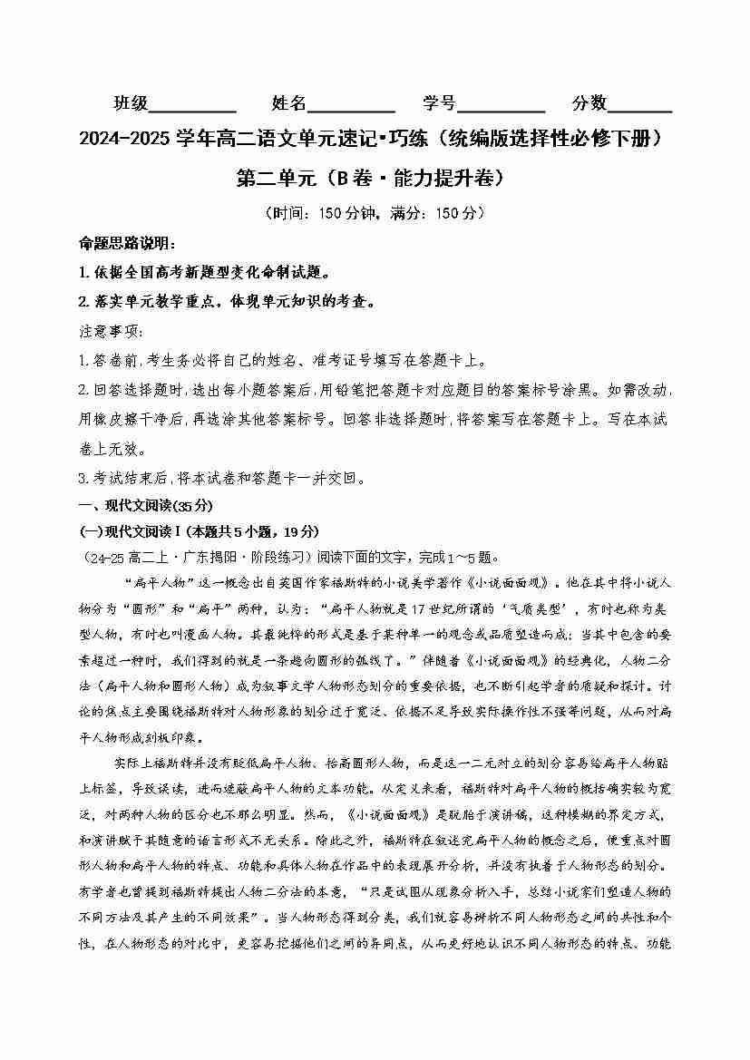 首页 > 全部 > 单元AB卷 > 第二单元(B卷·能力提升练)(统编版选择性必修下册)教师版