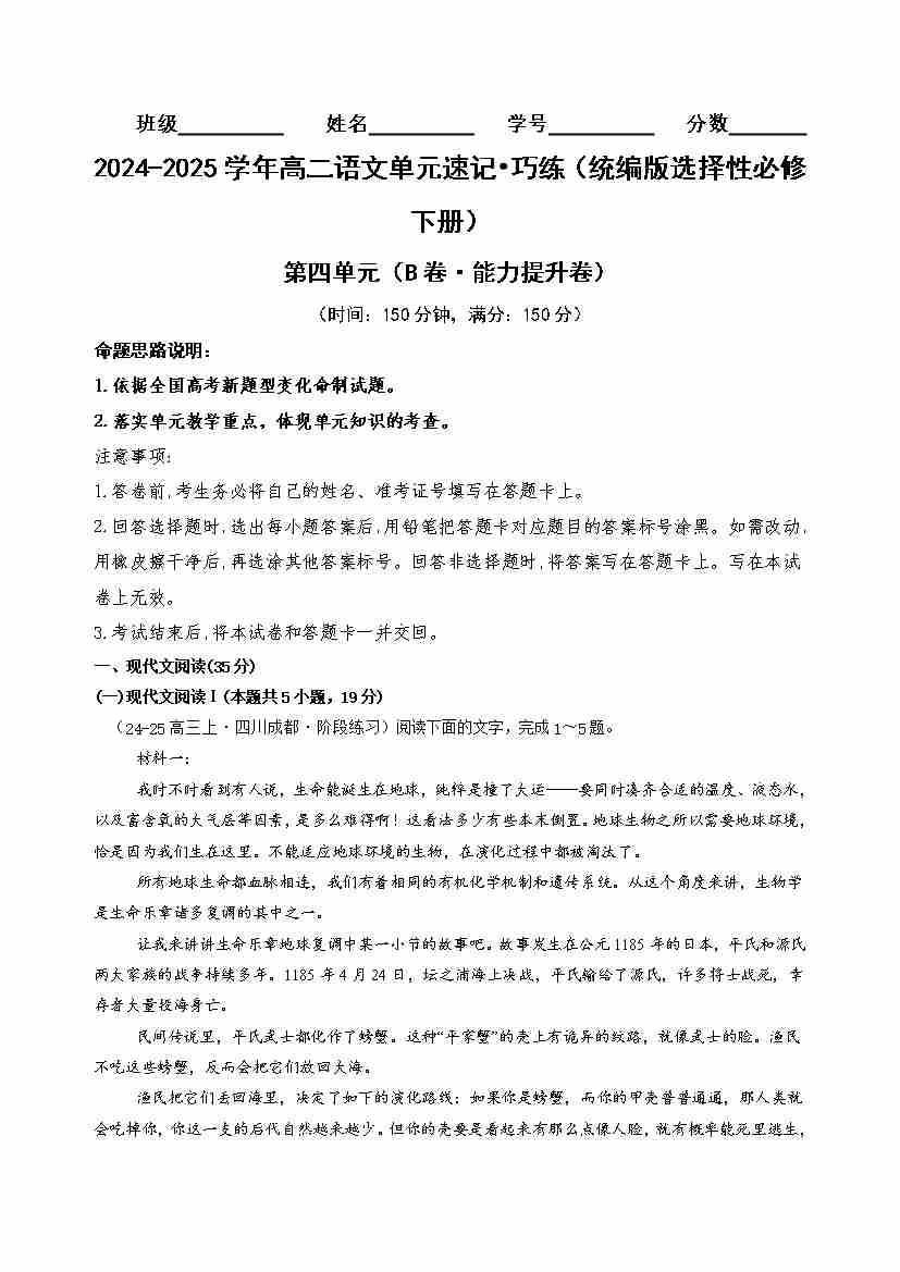 首页 > 全部 > 单元AB卷 > 第四单元(B卷·能力提升练)(统编版选择性必修)教师版