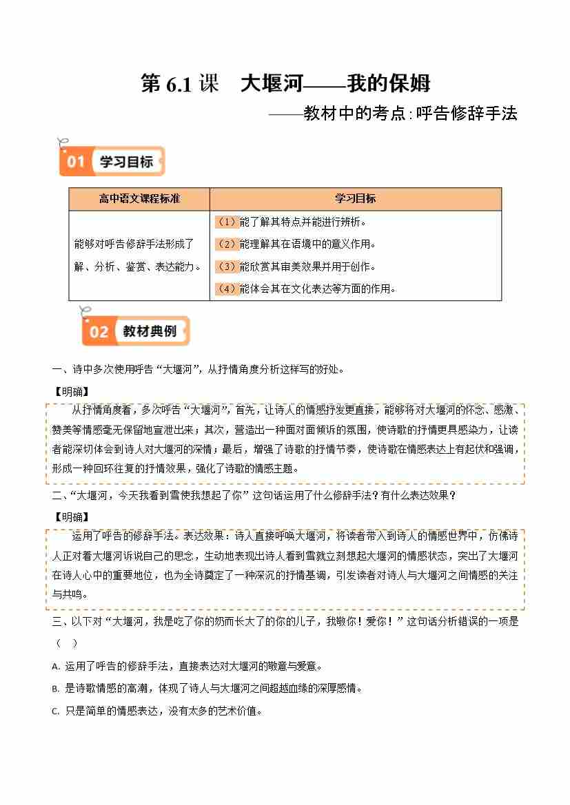 第6.1课 大堰河——我的保姆(教材中的考点:呼告修辞手法)(学生版)