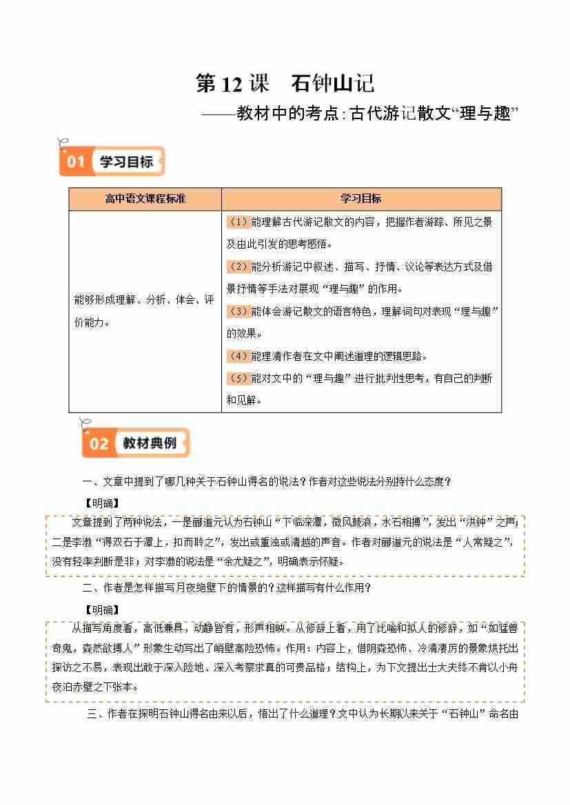第12课 石钟山记(教材中的考点:古代游记散文“理与趣”)(学生版)