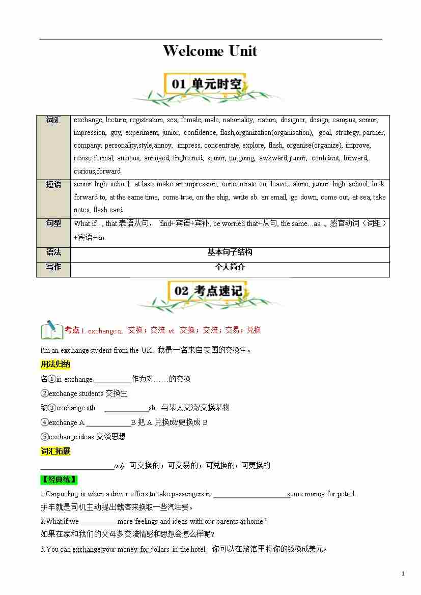 首页 > 全部 > 知识清单 > Welcome Unit【速记清单】-2024-2025学年高一英语单元速记•巧练(人教版2019必修第一册)(原卷版)