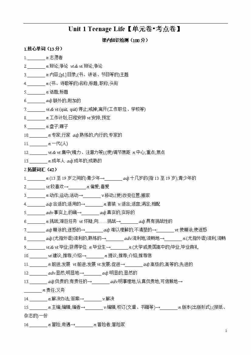 首页 > 全部 > 单元提升卷 > Unit 1 Teenage Life【单元卷•考点卷】-2024-2025学年高一英语单元速记•巧练(人教版2019必修第一册)(原卷版)